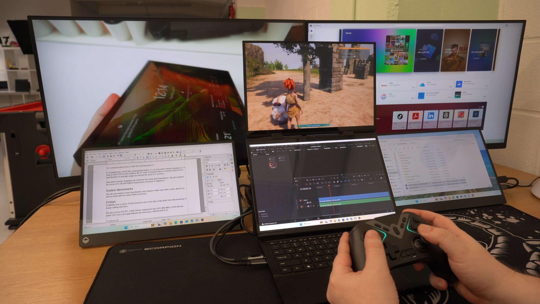 The GPD Duo can support up to two additional displays through its USB and HDMI ports, allowing for a four-screen setup. Adding the GPD G1 eGPU docking station expands that capability to six screens.