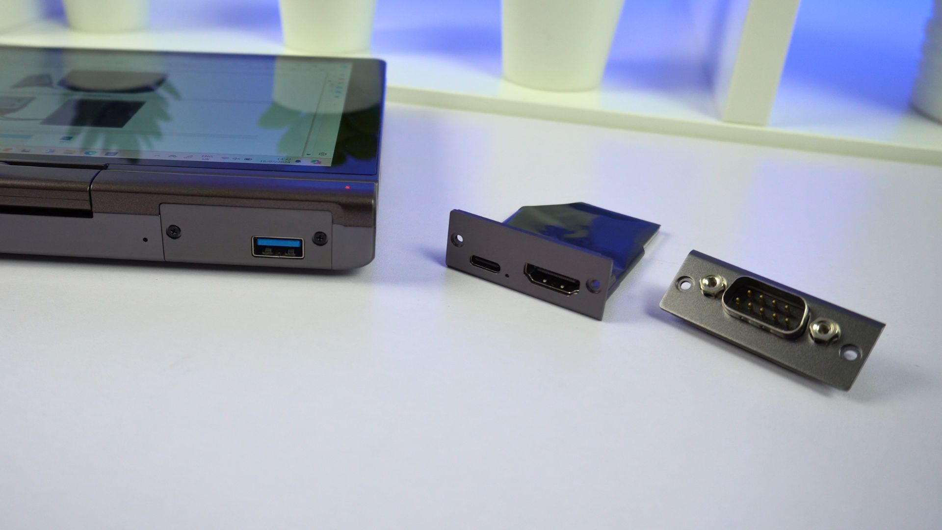 Next in our GPD Pocket 3 review we take a closer look at the star of the show, the modular port. Swapping out the module is straightforward: just remove two screws, replace the module, and screw it back in. Currently, two modules are available—an RS-232 DB9 port and a single-port KVM Module with HDMI and USB input.