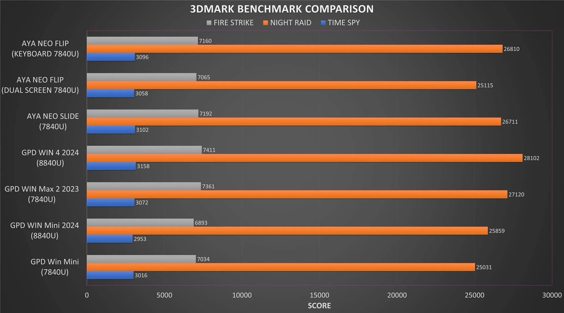 3DMark es un estándar de la industria para la evaluación comparativa del rendimiento de la CPU de uno o varios núcleos. En Time Spy obtenemos un rendimiento de 2.953 con GPD WIN Mini, ligeramente inferior al esperado. En Night Raid vemos puntuaciones en el extremo inferior de la escala. Y en Fire Strike volvemos a ver puntuaciones ligeramente inferiores a las esperadas.
