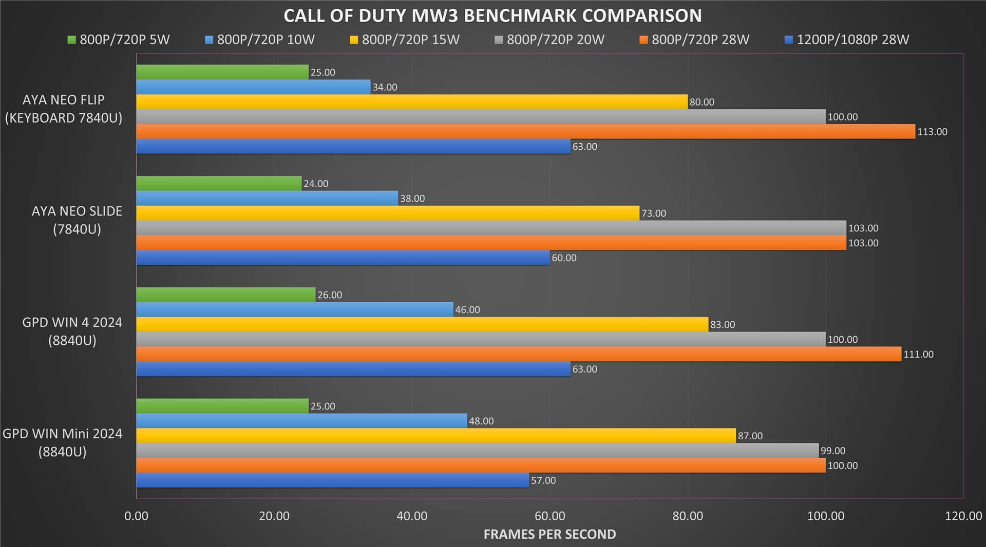 Funcionando con los ajustes gráficos más bajos. Cuadros por segundo más bajos a 1080P en comparación con el Win 4 2024, mejorando a medida que disminuye TDP.