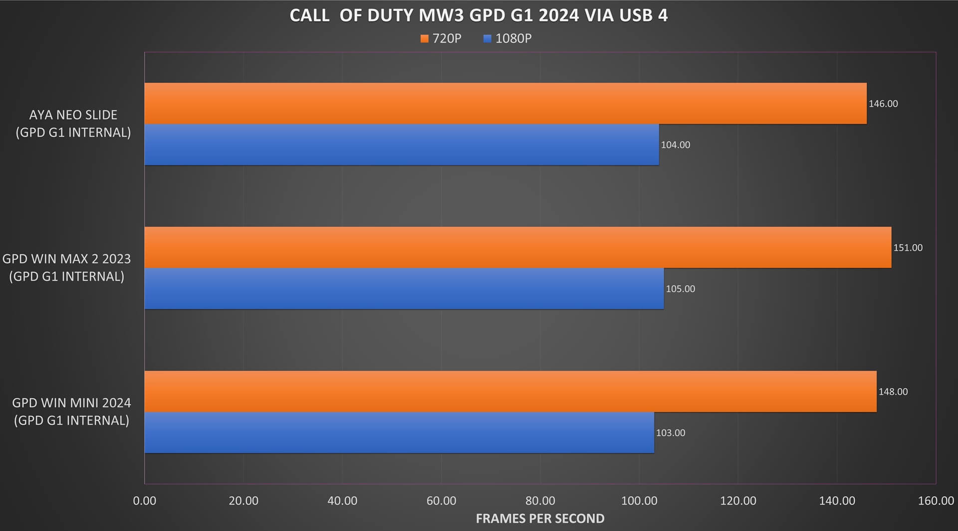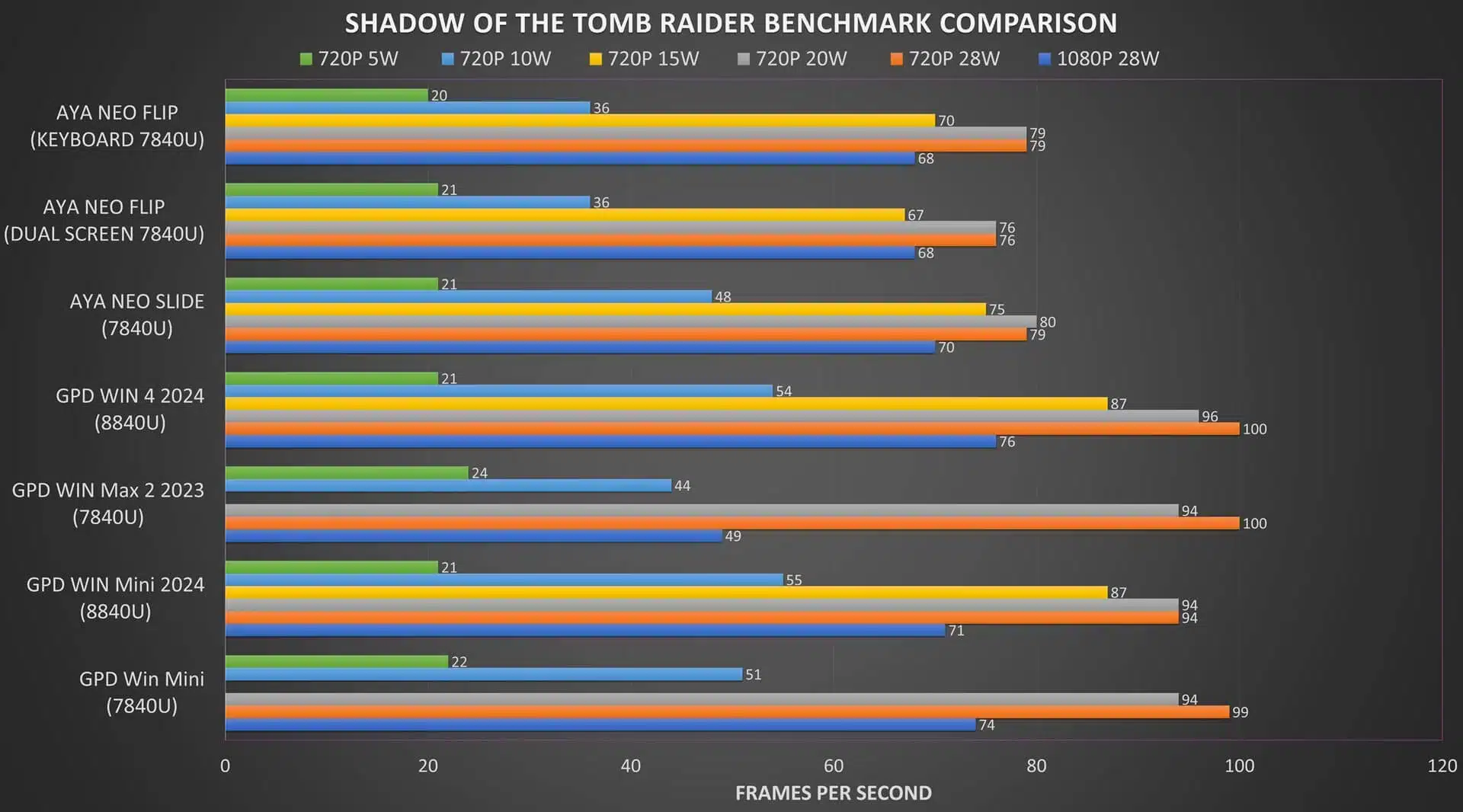 Realizamos pruebas de juegos a resoluciones 1080P y 720P y con varios ajustes de TDP (5, 10, 15, 20 y 28 W) para obtener una serie de resultados para comparar. Aunque carece de puerto OcuLink, conectamos una eGPU a través del puerto USB 4 y realizamos breves pruebas con el GPD G1 2024.