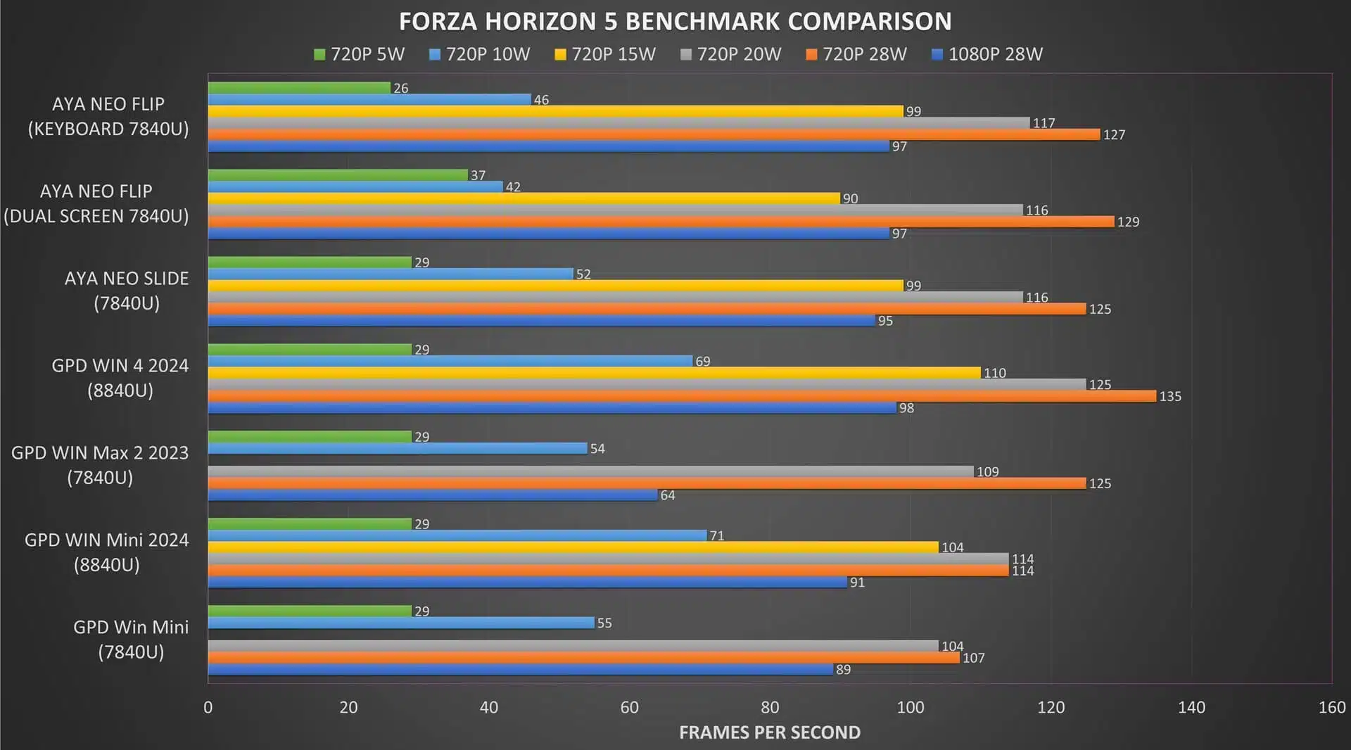 Funcionando con ajustes gráficos muy bajos. Buenos resultados a 720P, pero el rendimiento baja a mayor TDP en comparación con el GPD Win 4 2024. A 1080P, el promedio de fotogramas por segundo es inferior.