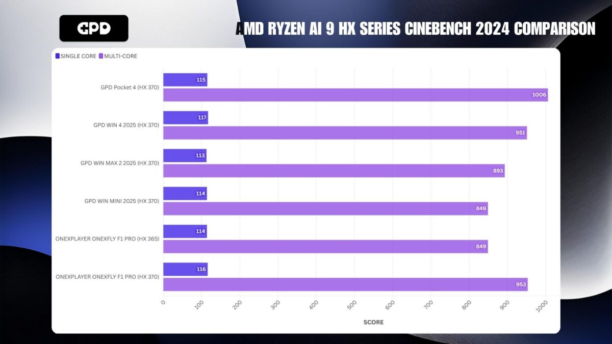 Más HX 370-es eszközökkel összehasonlítva az egymagos eredmények nagyjából azonosak, a többmagos eredmények pedig csak az ONEXFLY F1 Pro mögött helyezkednek el.