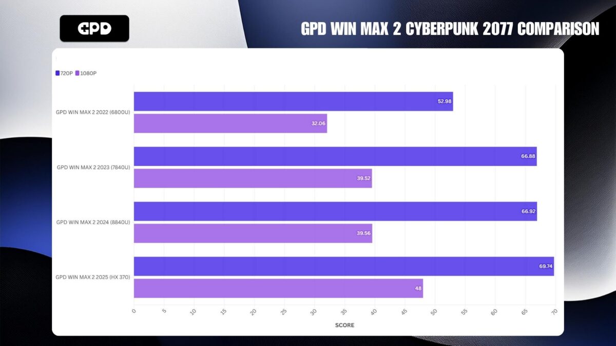 A GPD WIN MAX 2 2025 8,334 pontot ért el, ami 32%-os teljesítménynövekedést jelent a 6800U-hoz képest, és 11%-os növekedést a 8840U-hoz képest.